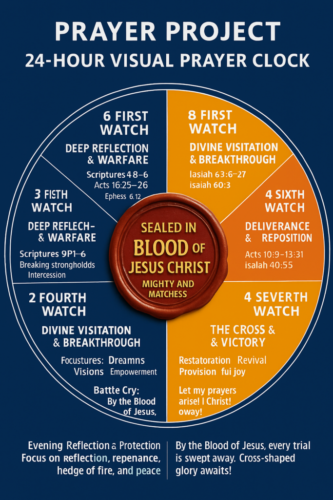 The 24-Hour Prayer Clock is a visual guide designed to align believers with the ancient biblical watches of the day and night. Each watch carries a distinct spiritual assignment, inviting the Body of Christ to stand in unified intercession, reflection, warfare, and expectancy according to Heaven’s timing.